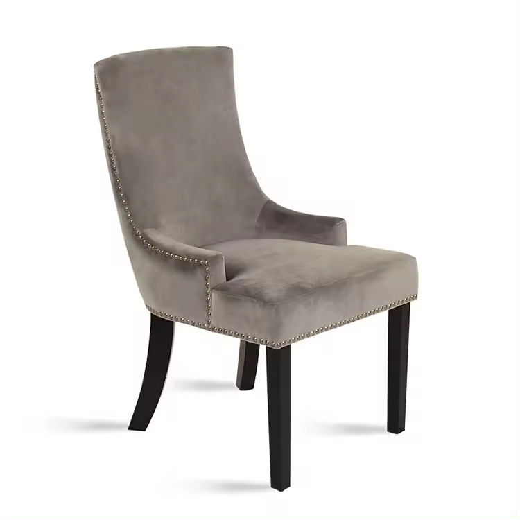 เก้าอี้ห้องรับประทานอาหารที่ทันสมัยคุณภาพสูงเก้าอี้รับประทานอาหารหุ้มเบาะกํามะหยี่หลังสูงสีเทาพร้อมขาไม้เนื้อแข็ง