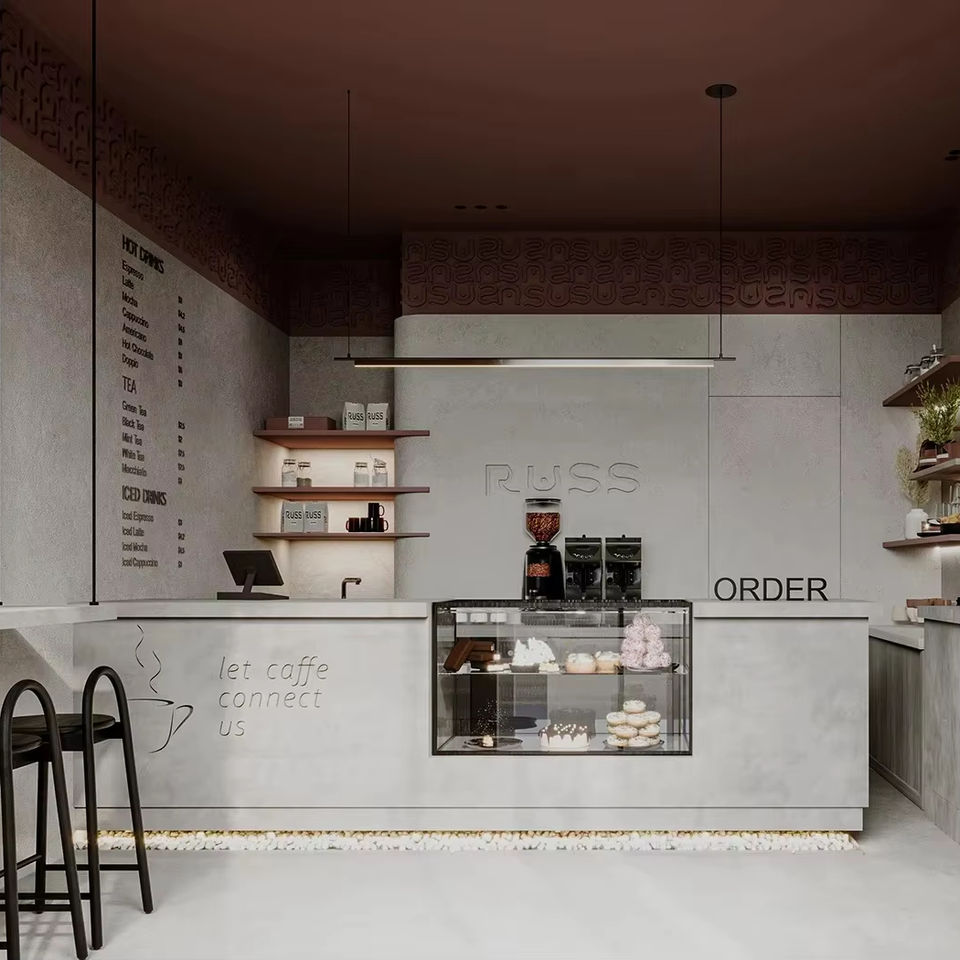 การออกแบบตกแต่งภายในร้านกาแฟสมัยใหม่ด้วยไฟ LED คุณภาพสูง | ตู้โชว์ขนมหวานสำหรับร้านค้าและตู้โชว์กาแฟไม้สั่งทำ