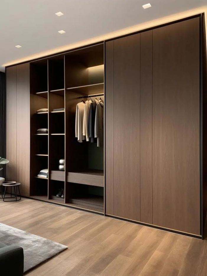 ตู้เสื้อผ้าห้องนอนแบบโมดูลาร์ทันสมัยคุณภาพสูง พร้อมประตูบานเลื่อนไม้ขอบทอง และพื้นที่จัดเก็บแบบผสมผสาน