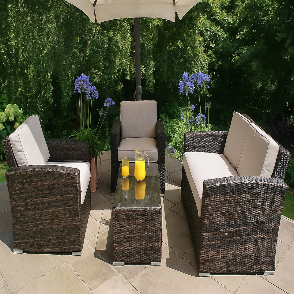 ชุดเครื่องจักสาน PE หวายกลางแจ้งทันสมัยคุณภาพสูงชุดเฟอร์นิเจอร์หวายกันน้ำเบาะสวนโซฟาโต๊ะกาแฟสำหรับระเบียงวิลล่า