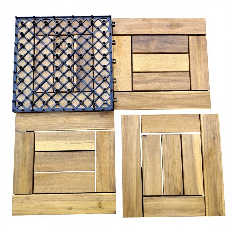 กระเบื้องพื้นไม้สี่เหลี่ยมอะคาเซียคุณภาพสูง ทันสมัย กันน้ำ ระบบล็อคสองชั้น ขนาด 300x300 มม. ผิวด้าน เหมาะสำหรับสระว่ายน้ำ