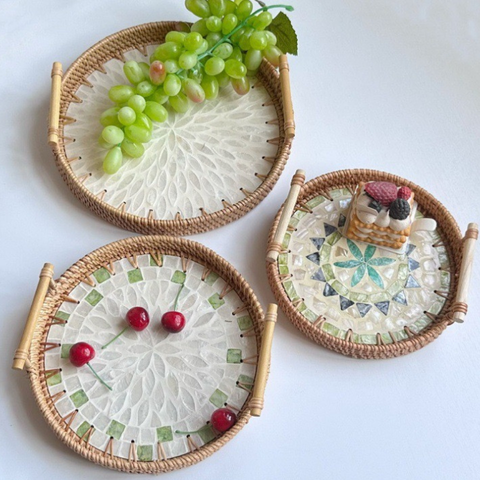 ถาดหวายทรงกลมโมเสคสำหรับจัดเก็บในบ้านถาดหวายสีมุก