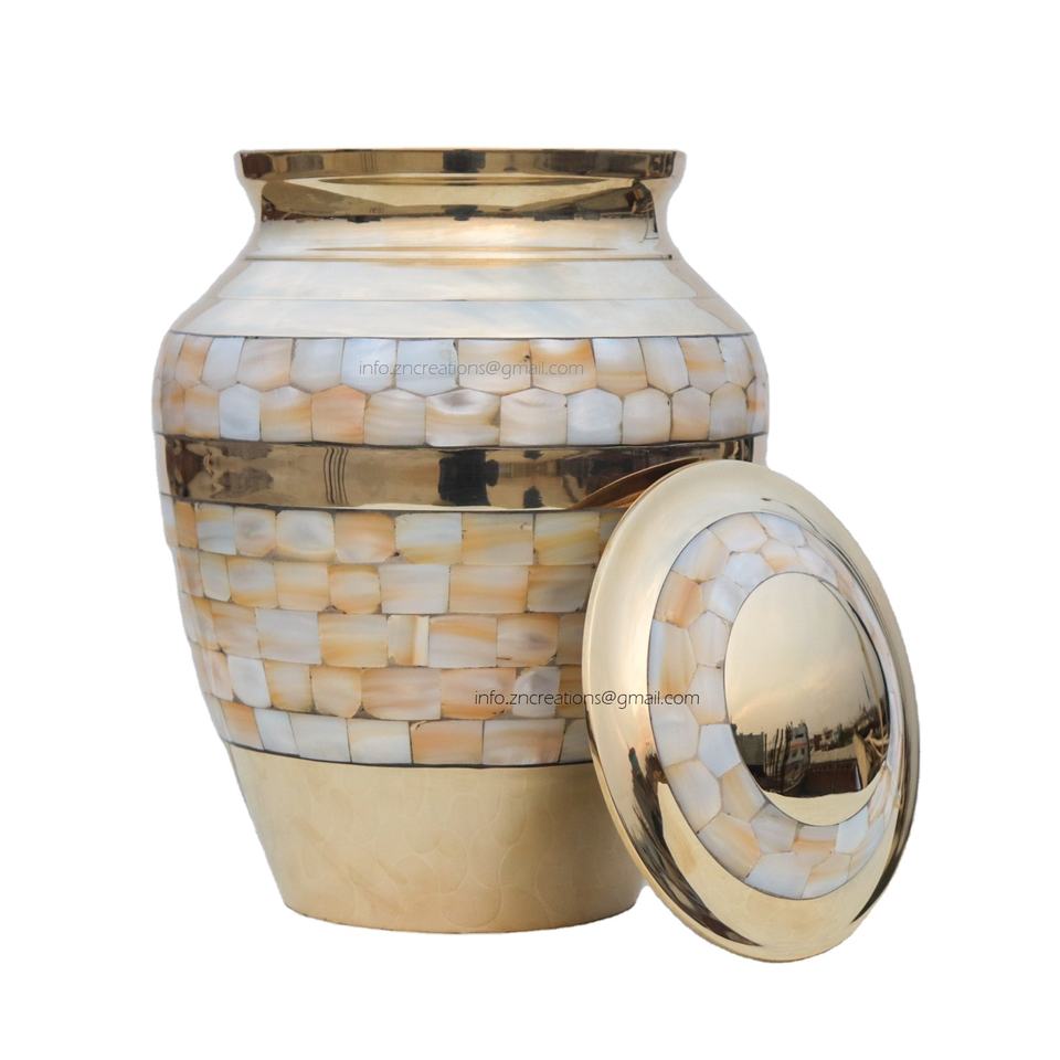 แม่ไข่มุกสำหรับเผาทองเหลือง,โกศสำหรับขี้เถ้ามนุษย์เถ้าทองเหลืองโกศพร้อมไม้ม็อบสลักในแบบฉบับโกศจากอินเดีย