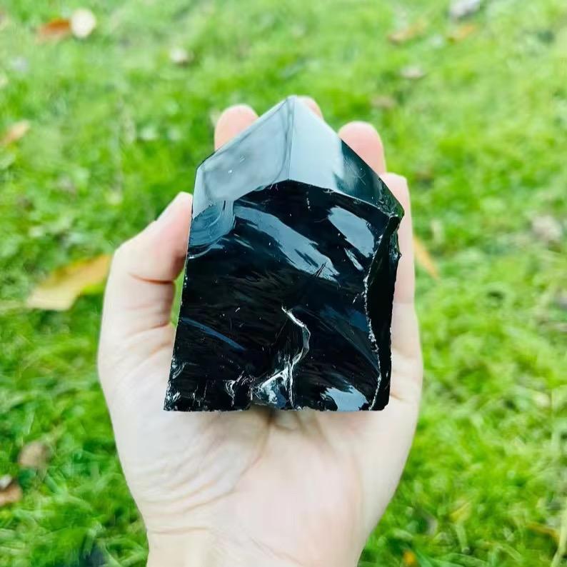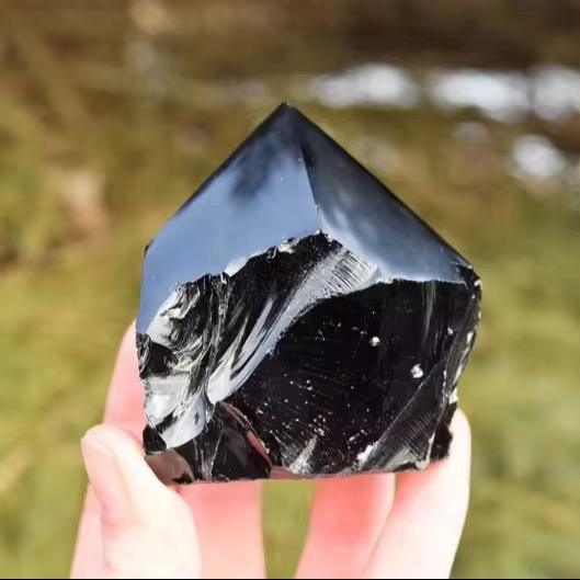 หินออบซิเดียนดำธรรมชาติคุณภาพสูง ขัดเงาเป็นทรงคริสตัล ใช้เป็นเครื่องรางเสริมดวง ตกแต่งบ้าน หินฮวงจุ้ยเพื่อการบำบัด ขนาด 3-4 นิ้ว