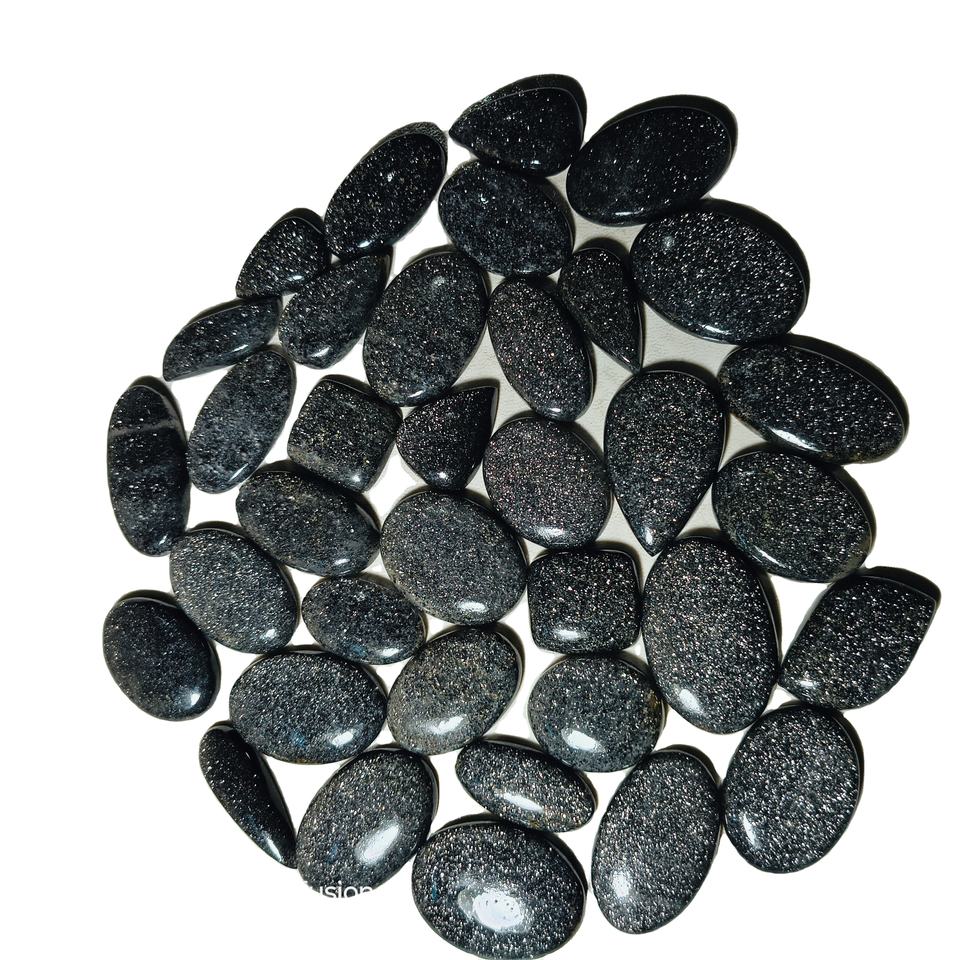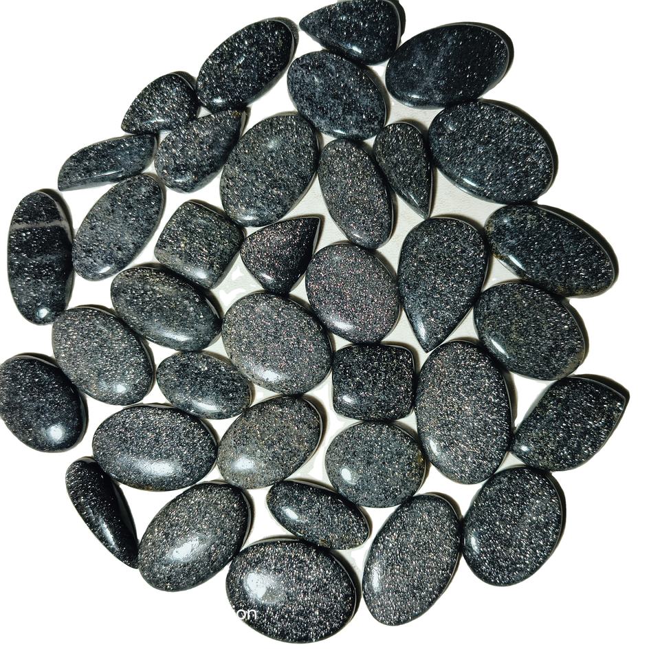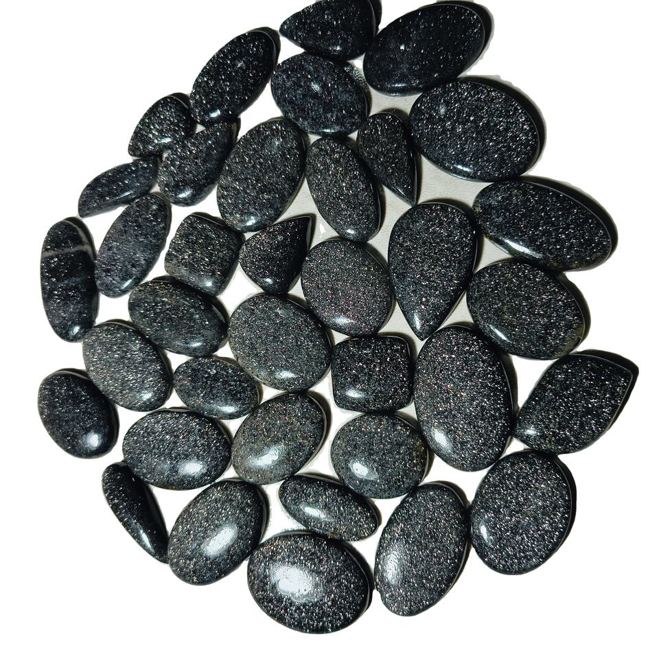 พลอยซันสโตนสีดำธรรมชาติคุณภาพสูง รูปทรงผสม ขนาด 20-45 มม. น้ำหนัก 8-12 กรัม รับรองโดยบุคคลที่สาม สำหรับทำเครื่องประดับ
