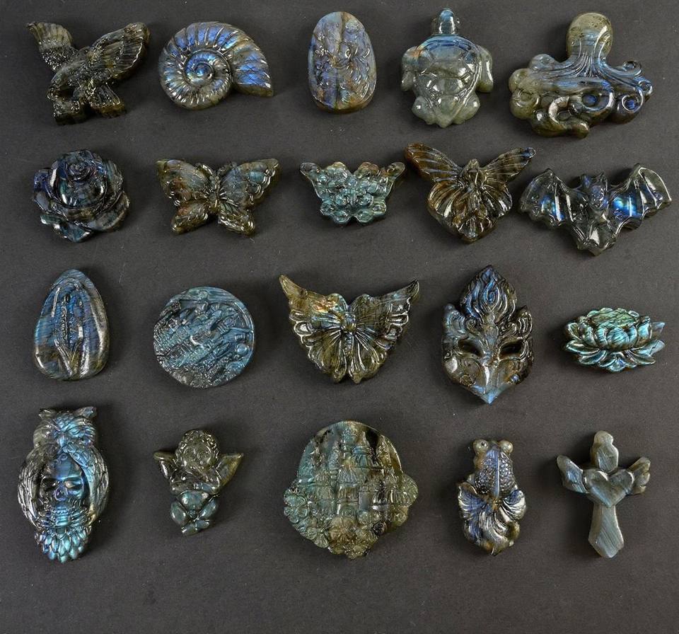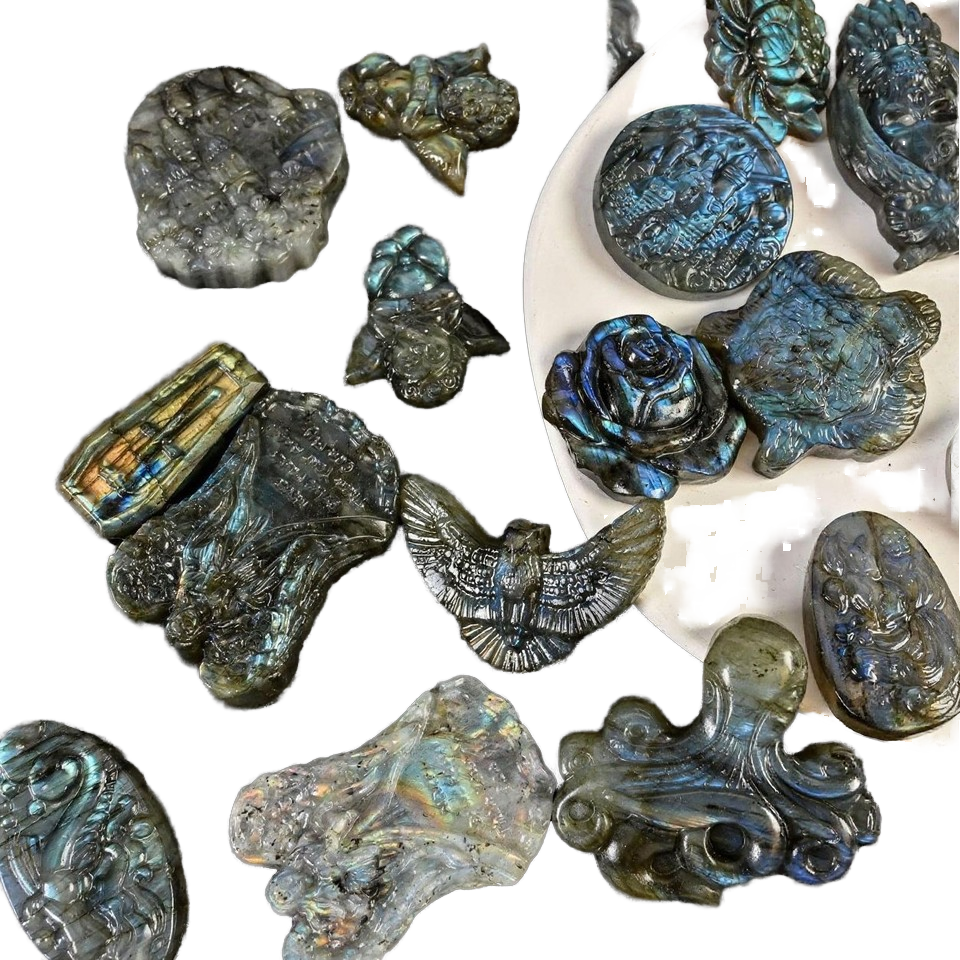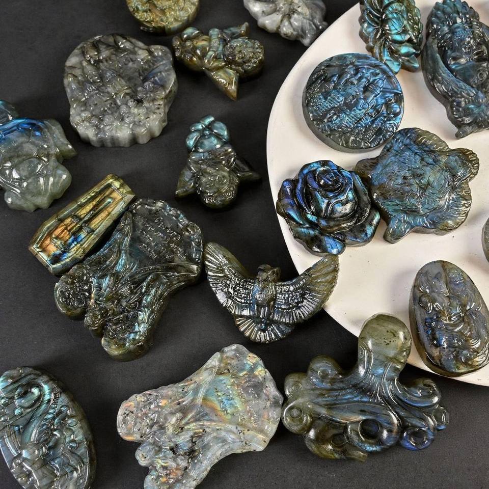 เครื่องประดับหินควอตซ์ประติมากรรมคริสตัลไฟลาบราดอไรต์ธรรมชาติสีฟ้าตกแต่งที่สลับซับซ้อน