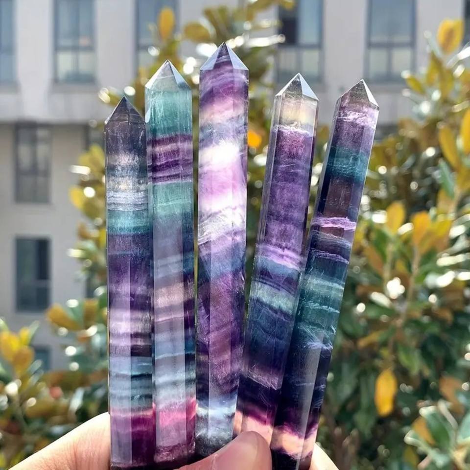 คริสตัลฟลูออไรต์ธรรมชาติคุณภาพสูง รูปทรงแหลมสีรุ้ง หินบำบัด หินฟลูออไรต์ทรงแท่ง สำหรับเสริมฮวงจุ้ย