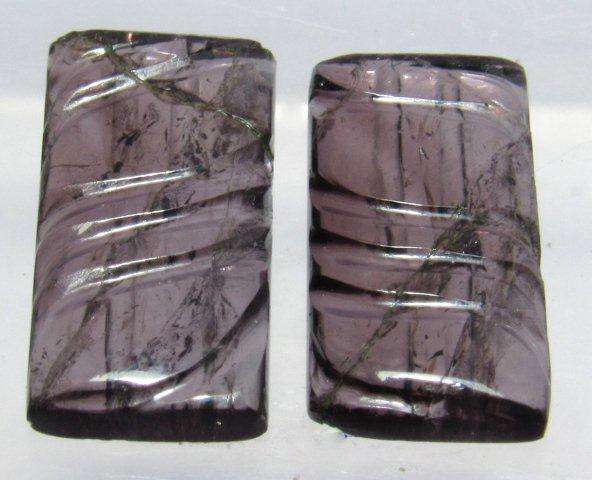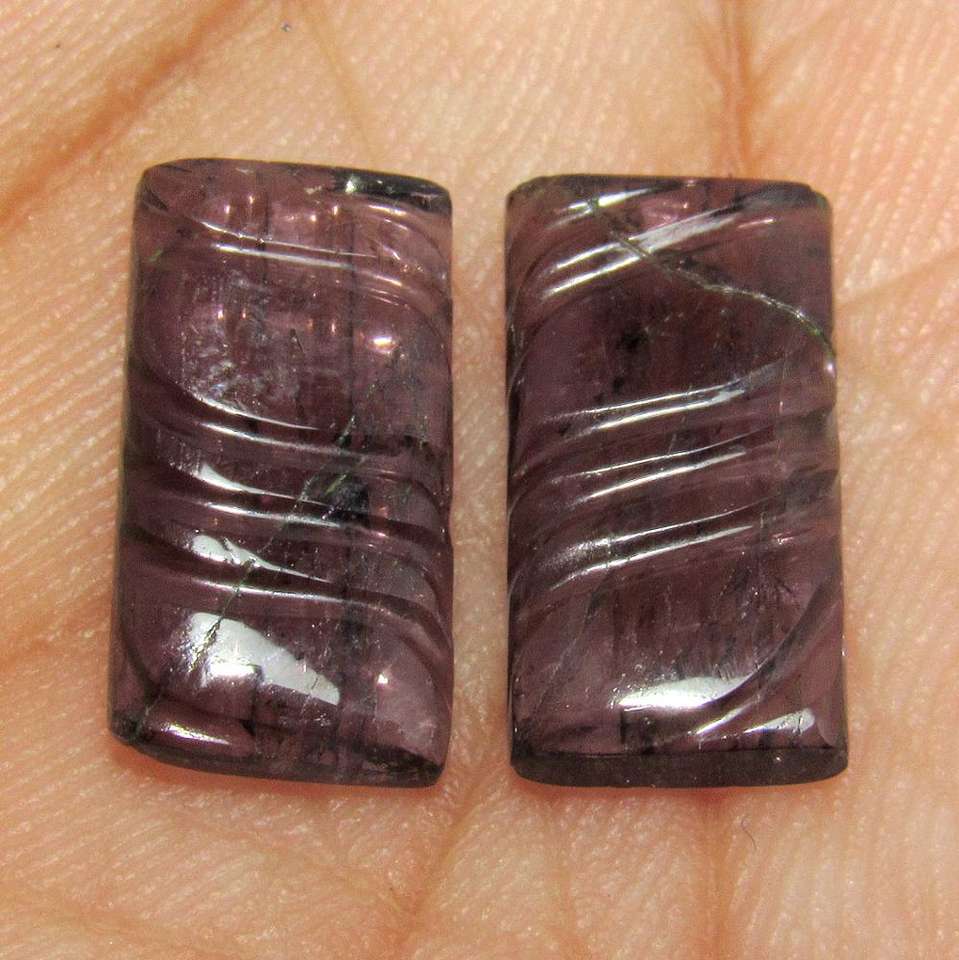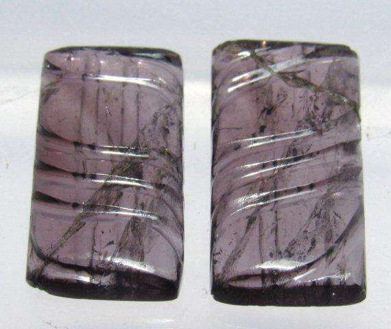 ทัวร์มาลีนสีม่วงธรรมชาติคุณภาพสูง รูปทรงสี่เหลี่ยมผืนผ้า แกะสลัก ได้รับการรับรองจากผู้ตรวจสอบอิสระ ราคาดี คู่หนึ่ง ดีไซน์รูปใบไม้