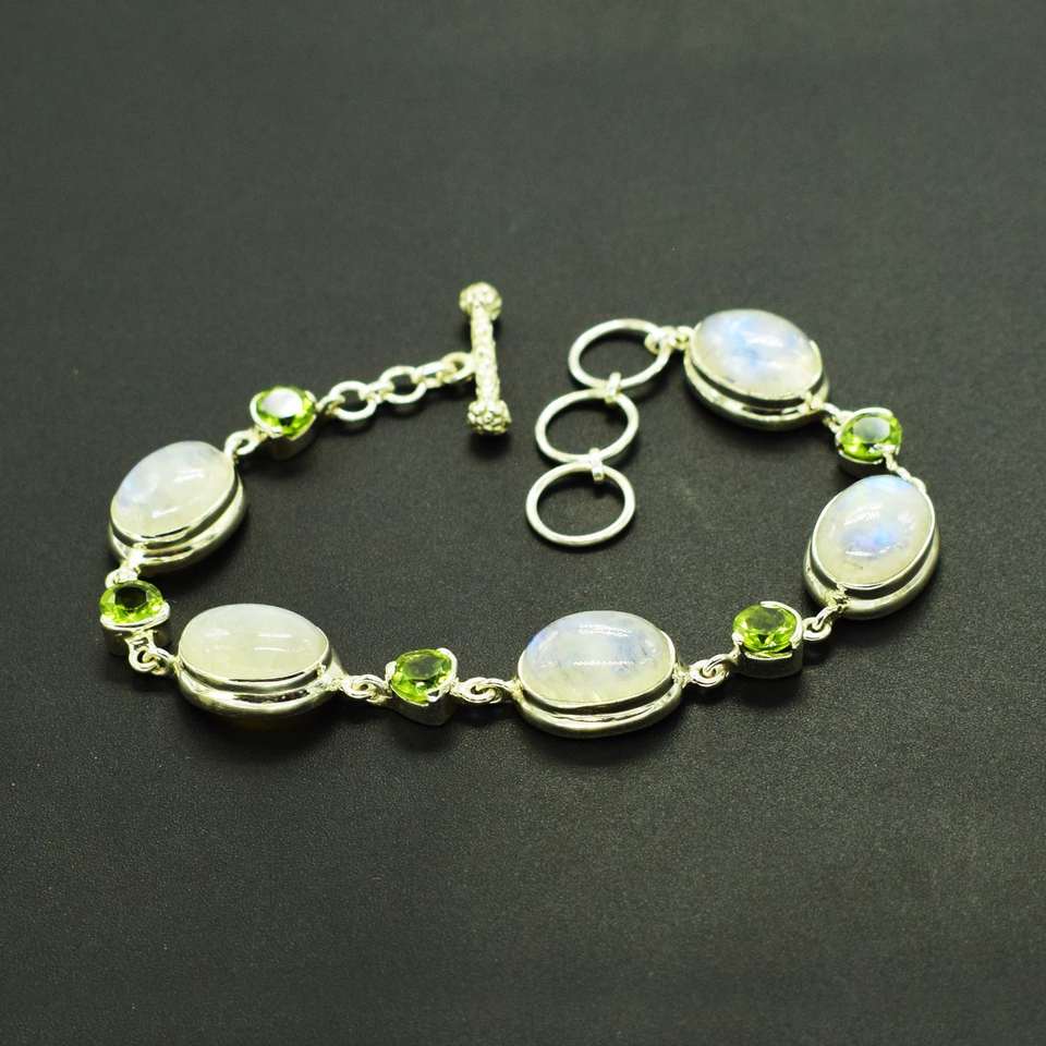 คุณภาพสูงธรรมชาติMoonstone Peridotอัญมณี 925 เงินสเตอร์ลิงBezelการตั้งค่าสร้อยข้อมือสําหรับสาวผู้หญิงเครื่องประดับFine