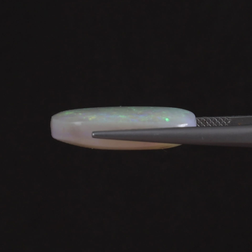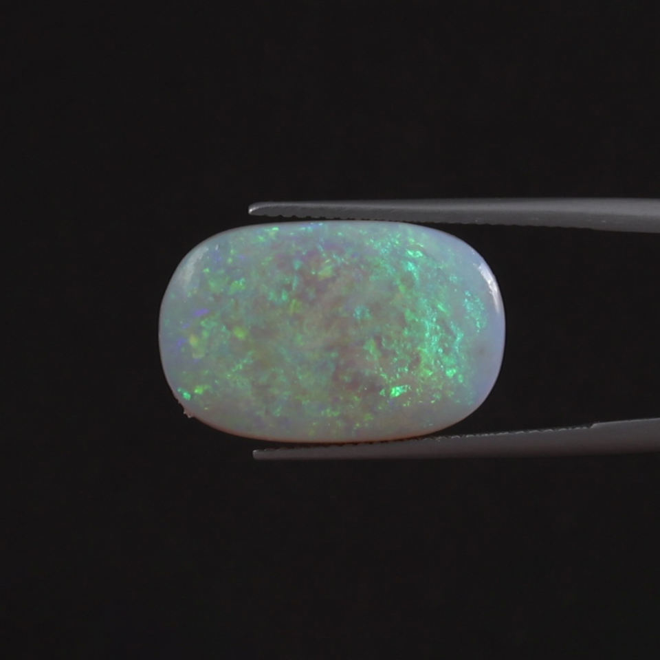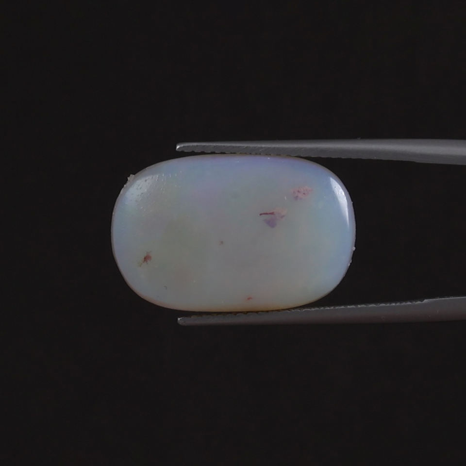 โอปอลธรรมชาติคุณภาพสูง รับรองโดย IGI สีขาว น้ำหนัก 11.58 กะรัต รูปทรงคุชชั่น ขนาด 21.5x13.5 มม. ตัดด้วยมือ ขัดเงา เคลือบแว็กซ์/น้ำมัน