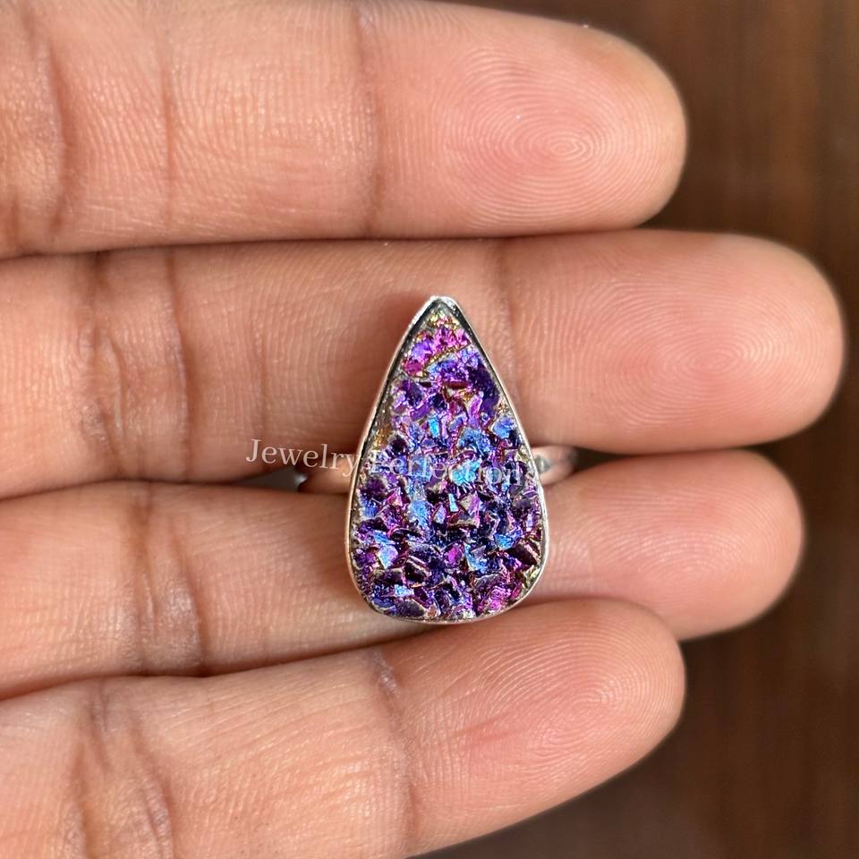 แหวนทองเหลืองชุบเงิน ประดับพลอยดรูซี่ไพไรต์เคลือบสีม่วงธรรมชาติ