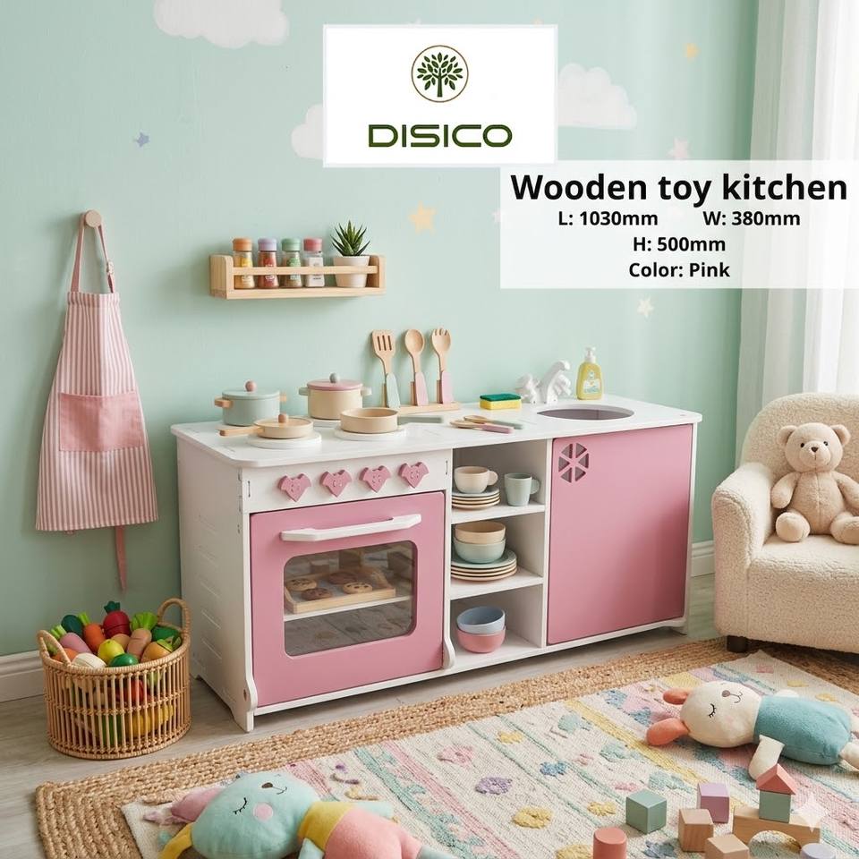 High Quality New Hao Hung Long an Wooden Toy Kitchen for Children Ages 2-7 with American Pine Plywood and Play Areas