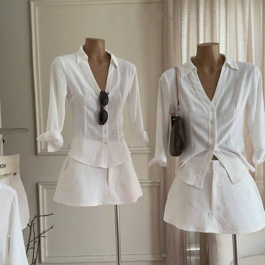 ชุดเสื้อคอวีสีขาวและกระโปรงสั้นแบบ OEM ODM คุณภาพสูง ขายส่งสำหรับผู้หญิง