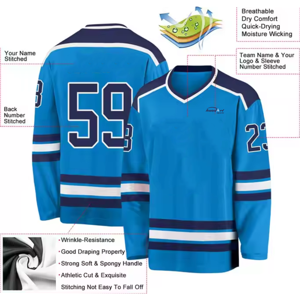 ชุดยูนิฟอร์มฮอกกี้น้ำแข็งสีขาวคุณภาพสูงแบบ OEM พร้อมโลโก้สั่งทำพิเศษ ระบายอากาศได้ดี ป้องกันแบคทีเรีย แห้งเร็ว แบบซับลิเมชั่น