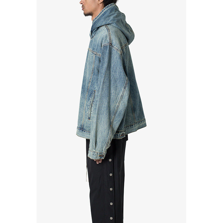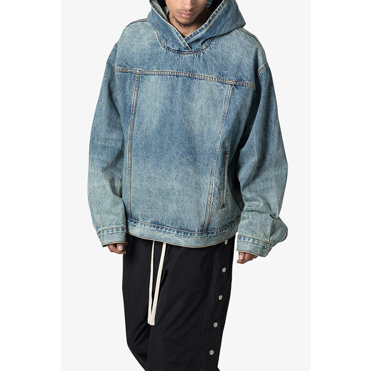 เสื้อฮู้ดดี้ผู้ชายทรงบ็อกซี่ แขนยาว ผ้าเดนิมวินเทจ ลุคทำเก่า ทรงโอเวอร์ไซส์ คุณภาพสูง ผลิตตามแบบ OEM