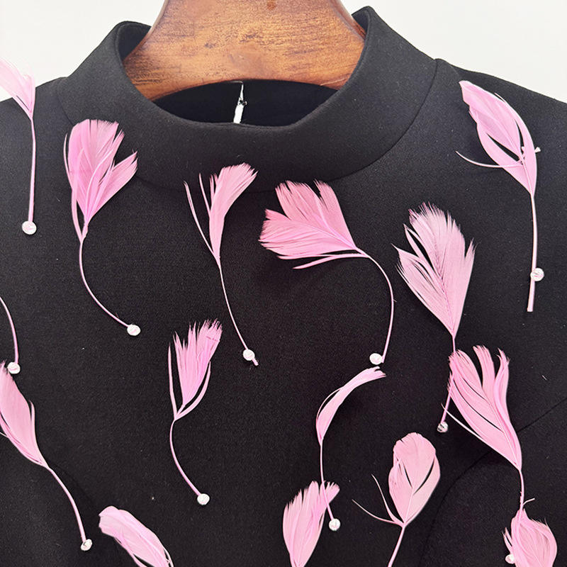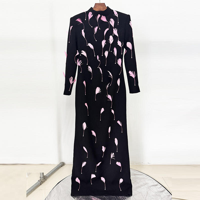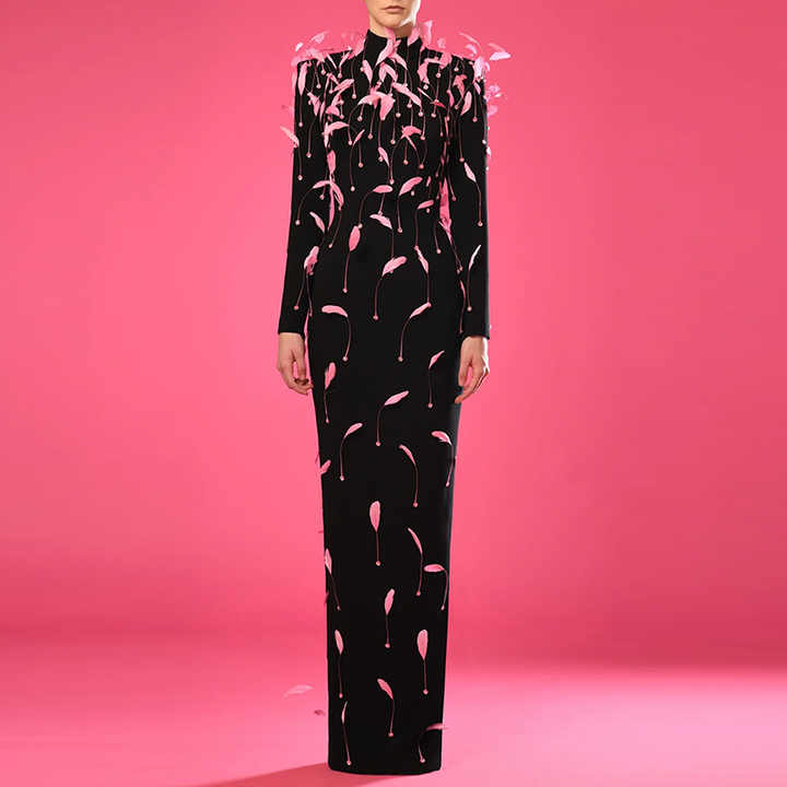 ชุดราตรียาวเปิดหลังตกแต่งด้วยขนนกลายจุดผ้าทอเนื้อละเอียดย้อมสีล้วนย้อมสี