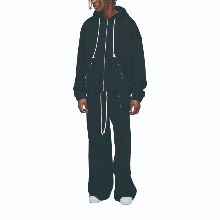 ชุดแทรคสูทผู้ชายแขนยาวทรงหลวมแบบวินเทจประดับคริสตัล พร้อมกางเกงขาบานทรงบ็อกซี่มีซิปคุณภาพสูง