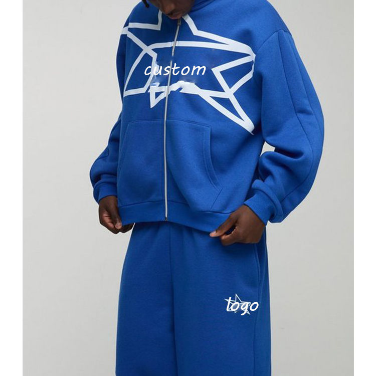 High Quality Winter Oversized Boxy Solid Zip Hooded 100% Cotton Tracksuit Loose Wide Leg Pant Heavyweight Fleece Man Set