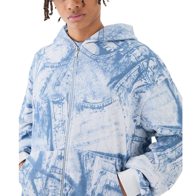 ชุดเซ็ตเสื้อฮู้ดดี้ผ้าวาฟเฟิลเนื้อหนาพิมพ์ลายทรงบ็อกซี่ขนาดใหญ่พิเศษพร้อมซิปและกางเกงขาสั้นสำหรับผู้ชาย