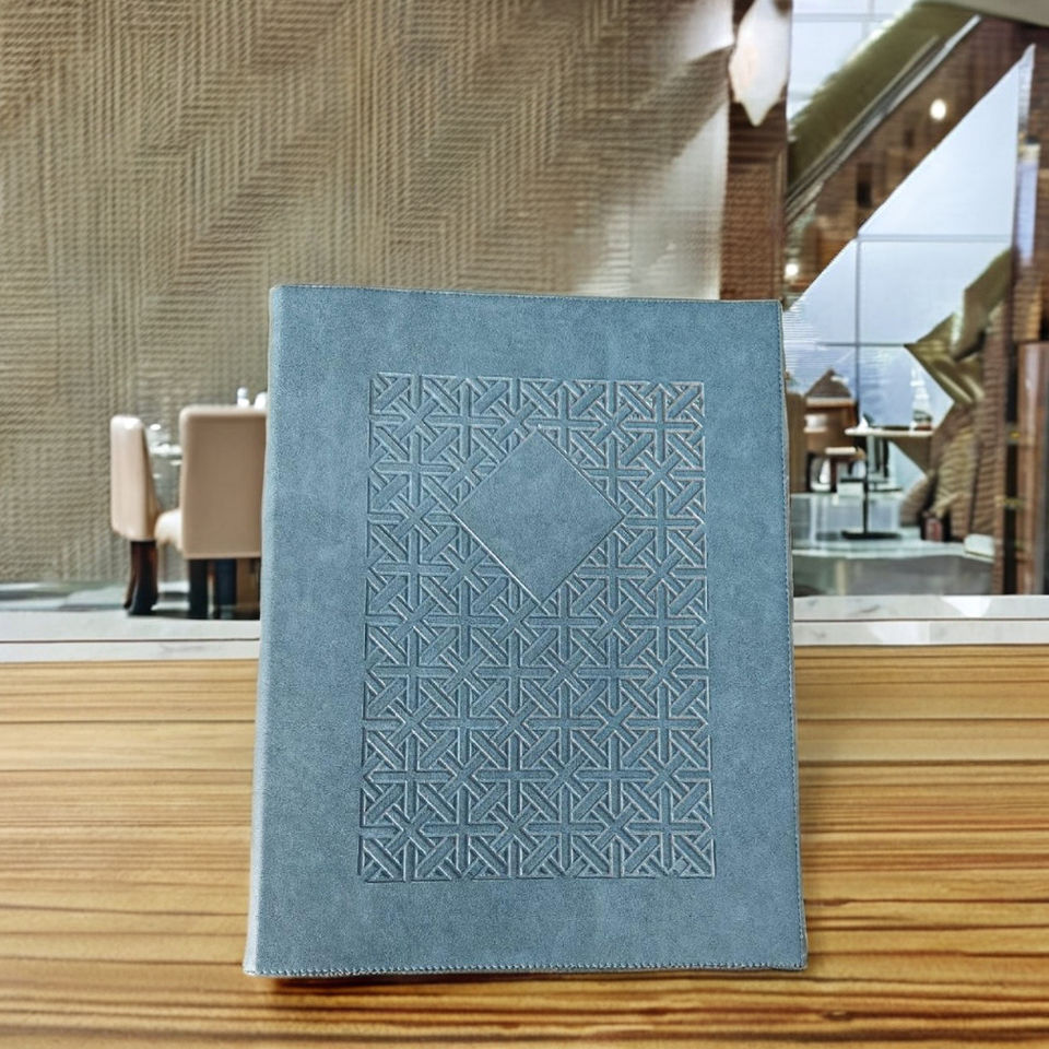 คำอธิบาย:โฟลเดอร์เมนูหนังเทียมพร้อมโลโก้ชุบนิกเกิล