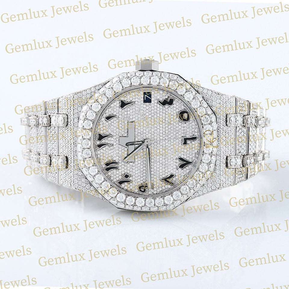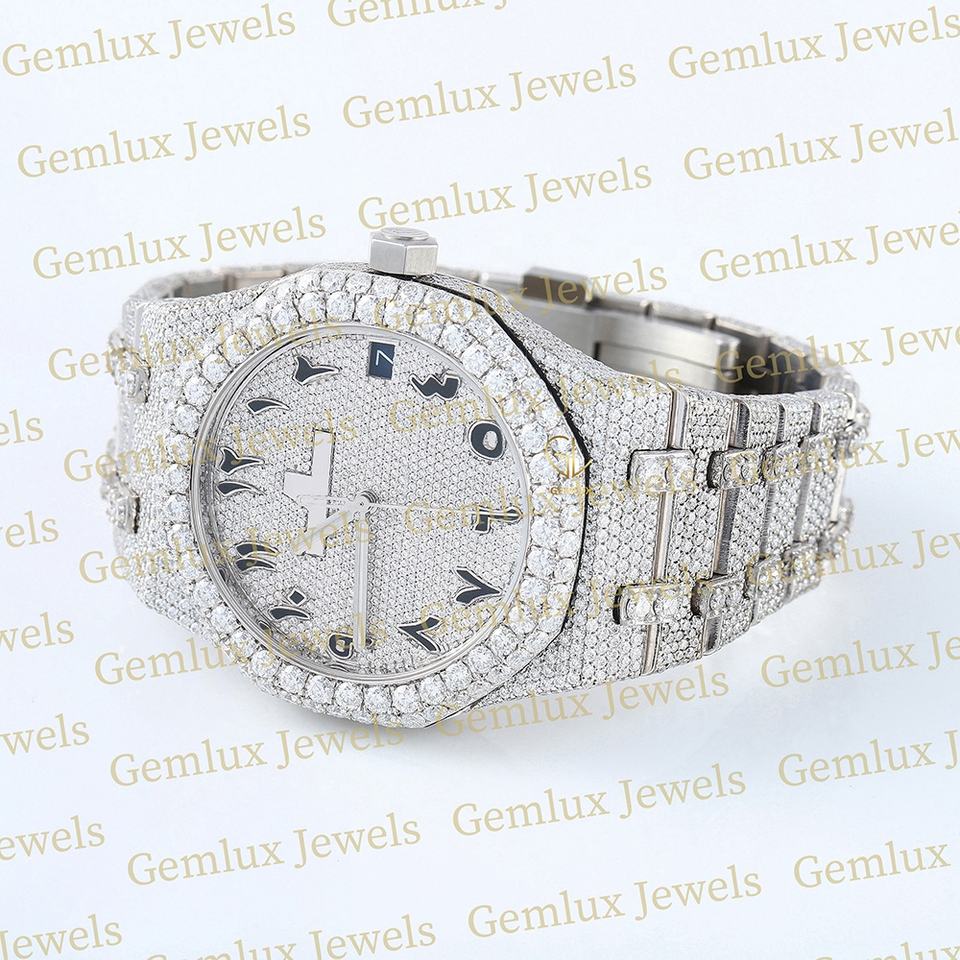 นาฬิกาฮิปฮอปสีขาวเต็มรูปแบบสำหรับผู้ชายเครื่องทดสอบเพชรผ่านเพชรหน้าปัดภาษาอาหรับ