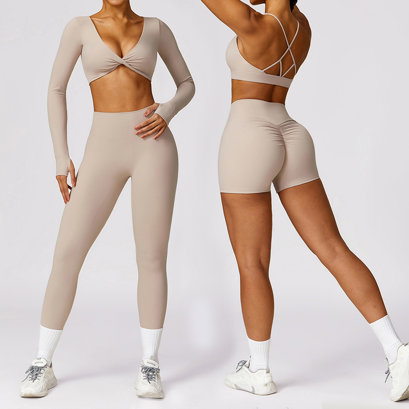 ชุดออกกำลังกายพิลาทิสคุณภาพสูง เสื้อผ้ากีฬาฟิตเนสระบายอากาศดี กางเกงออกกำลังกายเอวสูงแบบไขว้ ชุดโยคะ