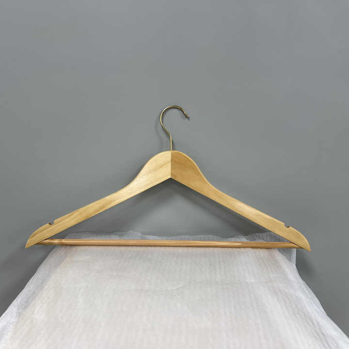 ไม้แขวนเสื้อไม้สนคุณภาพสูง พร้อมตะขอสแตนเลส รับทำโลโก้ ดีไซน์ทนทาน ผลิตในเวียดนาม