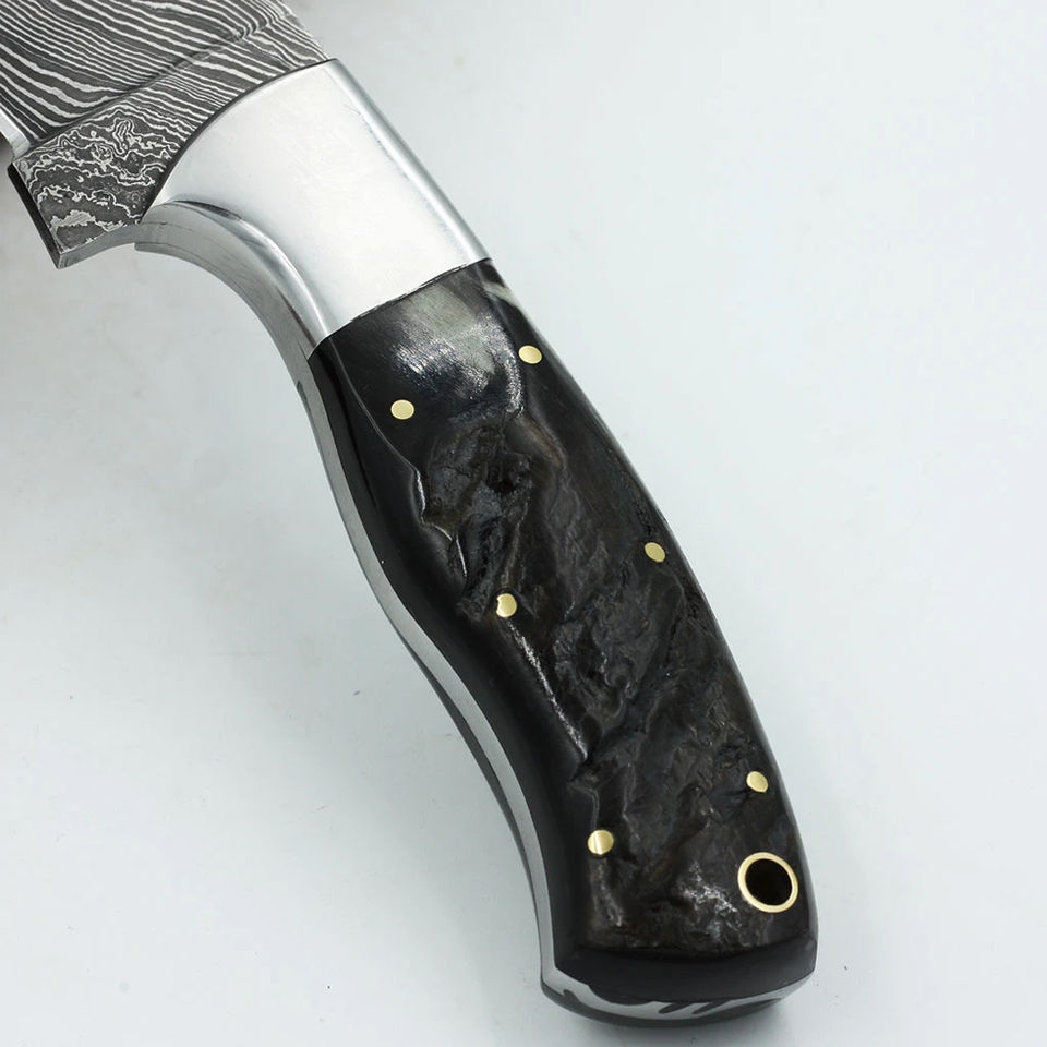 มีดโบวี่คุณภาพสูงแบบพกพาสำหรับตั้งแคมป์กลางแจ้ง เอาตัวรอด ล่าสัตว์ ใบมีดเหล็กดามัสกัส ขอบหยัก ใบมีดสแตนเลส OEM