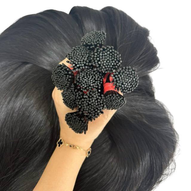ผมต่อแบบ I-Tip คุณภาพสูง ผมตรงแบบรัสเซีย เงางามเป็นลอนแบบธรรมชาติ ผมสองชั้น เกรด Remy Virgin ยังไม่ผ่านการแปรรูป ติดด้วยเคราติน สามารถย้อมสีได้