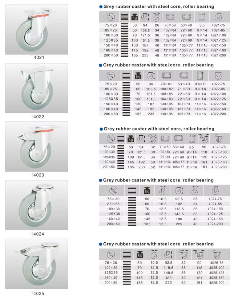 Grey rubber caster with steel core roller bearingหมายเลขรุ่น