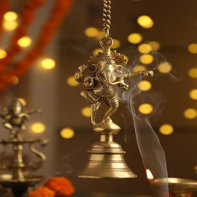 กระดิ่งแขวนทำจากทองเหลืองรูปทรงพระพิฆเนศแกะสลักด้วยมือแนววินเทจวัตถุตกแต่งโลหะล้วนสำหรับบ้านสำนักงานวัดวันเกิด