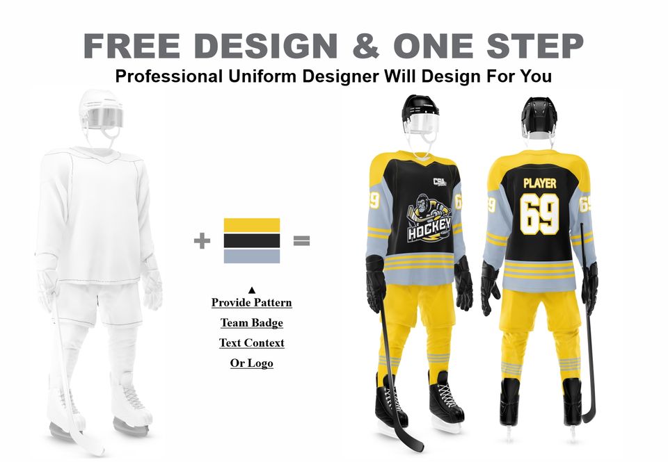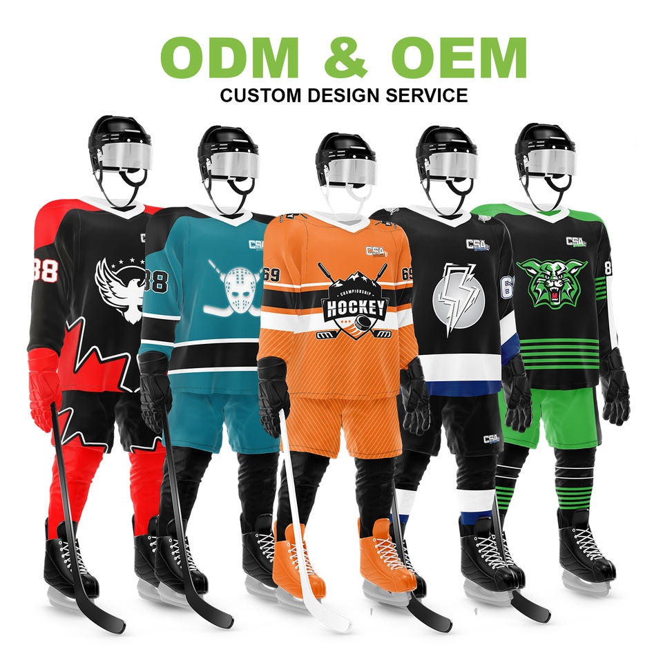 เครื่องแบบทีมฮ็อกกี้น้ำแข็งผ้าโพลีเอสเตอร์แห้งเร็วเครื่องแบบทีมฮ็อกกี้น้ำแข็งของผู้ชายดีไซน์ยอดเยี่ยมปรับแต่งได้
