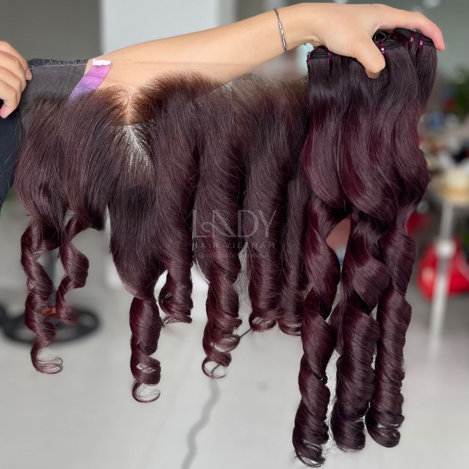 ช่อผมดิบที่มีคุณภาพสูงเพื่อทำเป็นช่อผมหยิกที่มีหน้าผากและมัดเพื่อทำวิกผม