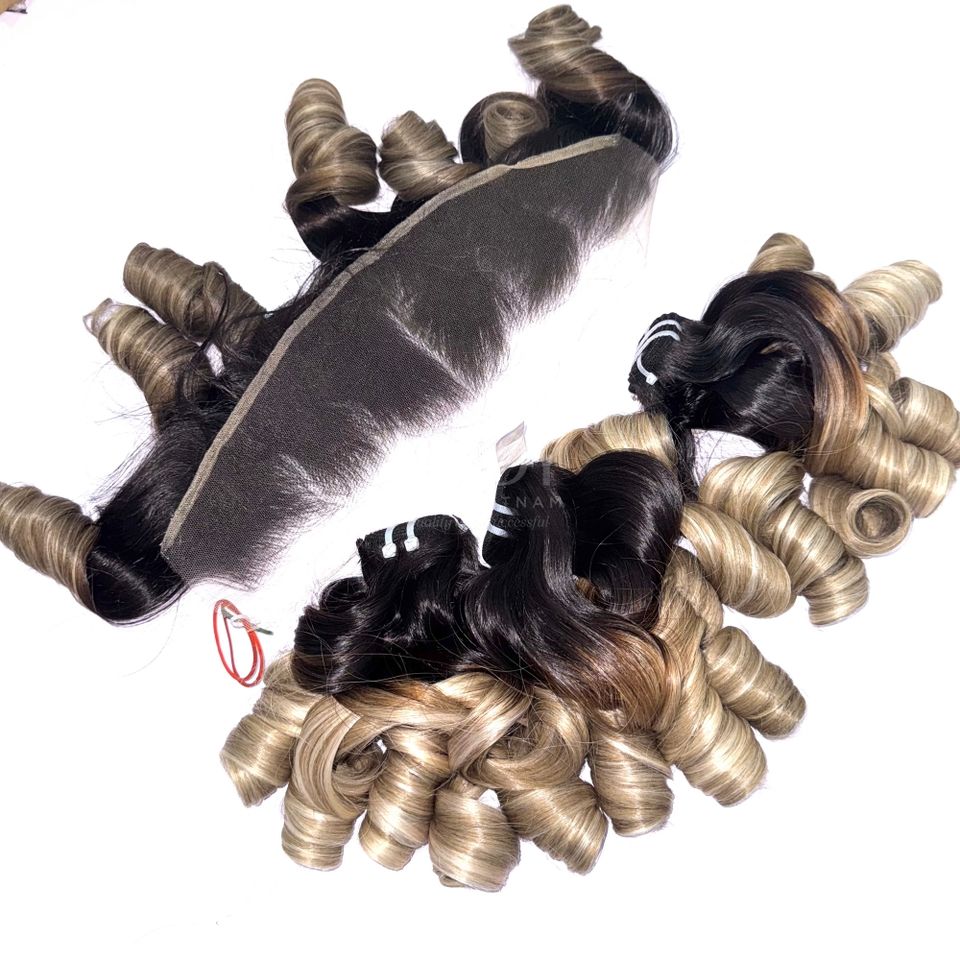 ช่อผมดิบที่มีคุณภาพสูงเพื่อทำเป็นช่อผมหยิกที่มีหน้าผากและมัดเพื่อทำวิกผม