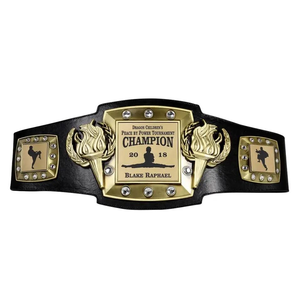 เข็มขัดแชมป์หนังแท้คุณภาพสูงสั่งทำพิเศษสำหรับมวย เทควันโด ยิวยิตสู คาราเต้ งานแฮนด์เมด โลโก้ปั๊มนูน แผ่นโลหะ 3 มิติ สีทอง