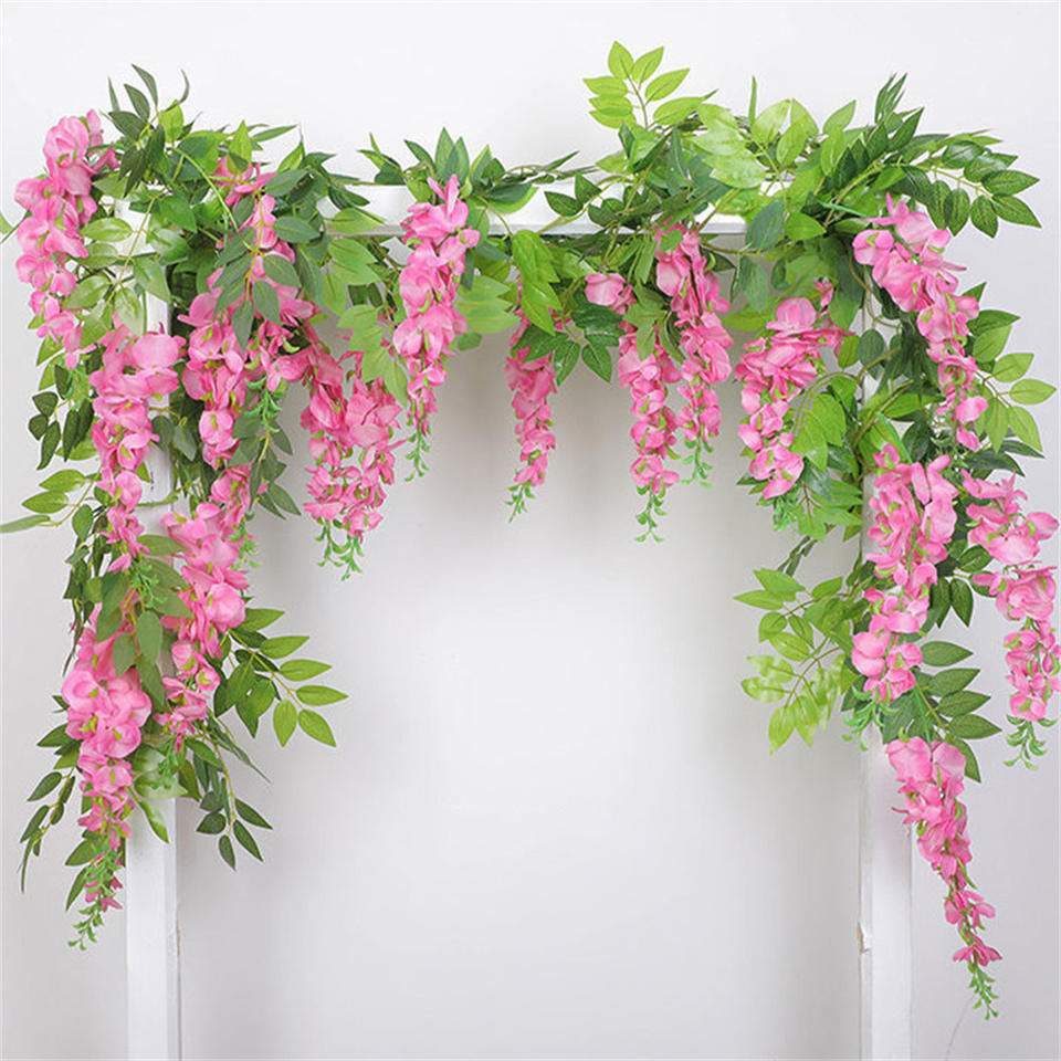 ดอกไม้วิสเทอเรียประดิษฐ์ทำจากผ้าไหมพวงมาลัยสีขาวสีม่วงดอกไม้แขวนสำหรับตกแต่งเพดานงานแต่งงาน
