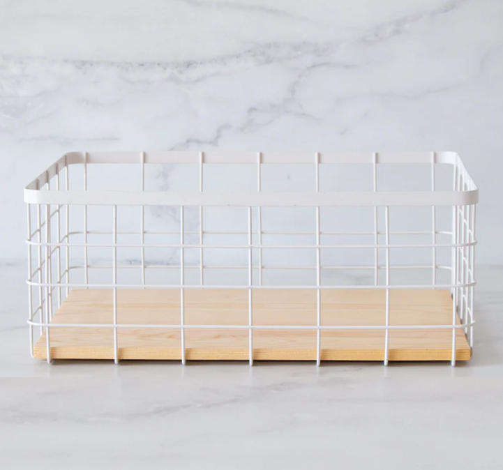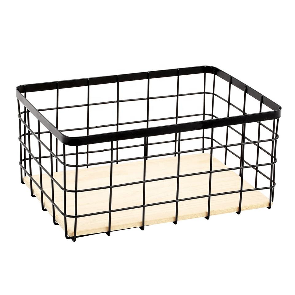 ตะกร้าเก็บของแบบลวดโลหะสีดำคุณภาพสูง รูปทรงสี่เหลี่ยมผืนผ้า ราคาประหยัด พร้อมฐานไม้ สำหรับวางบนเคาน์เตอร์