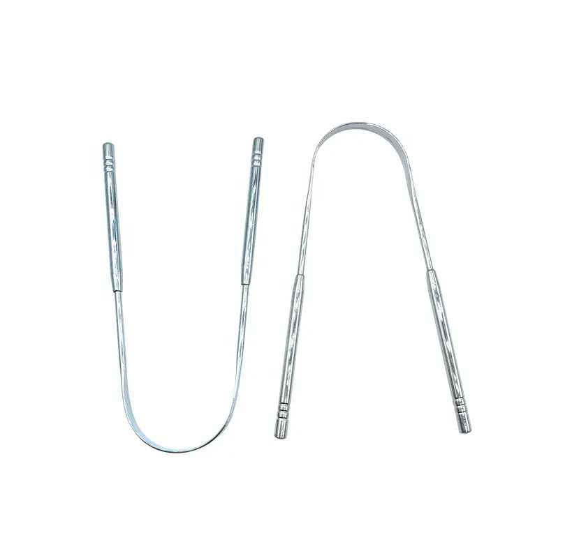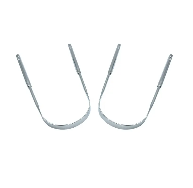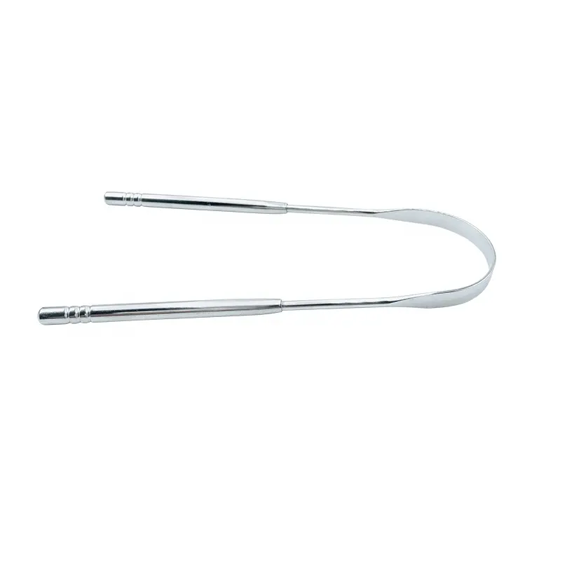 เครื่องขูดลิ้นแบบแมนนวลใช้ซ้ำได้อุปกรณ์ขัดฟันสำหรับทำความสะอาดช่องปากทำจากสแตนเลสเกรดการผ่าตัด