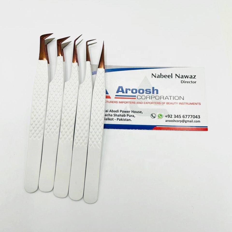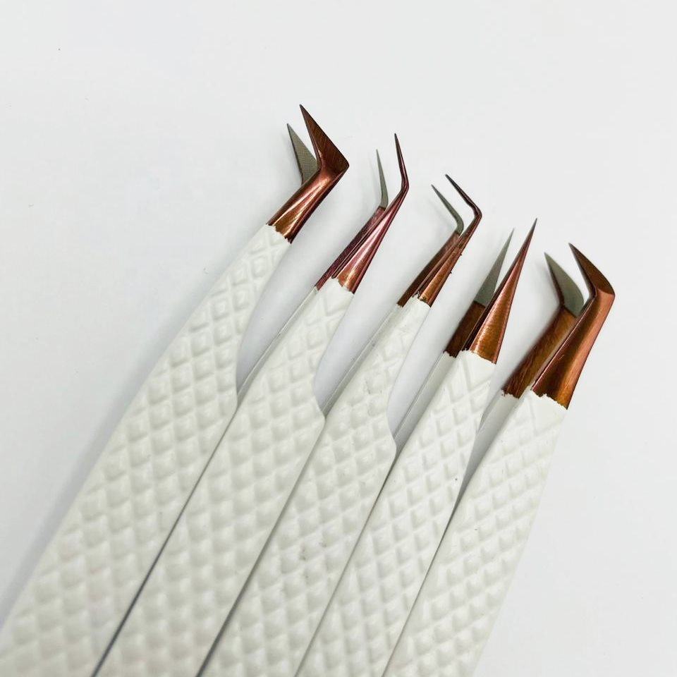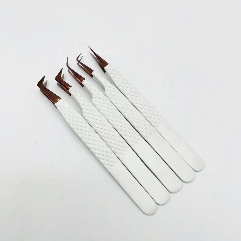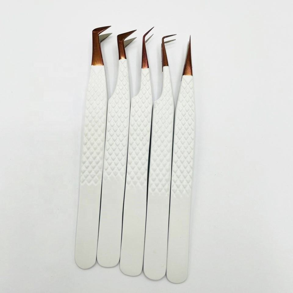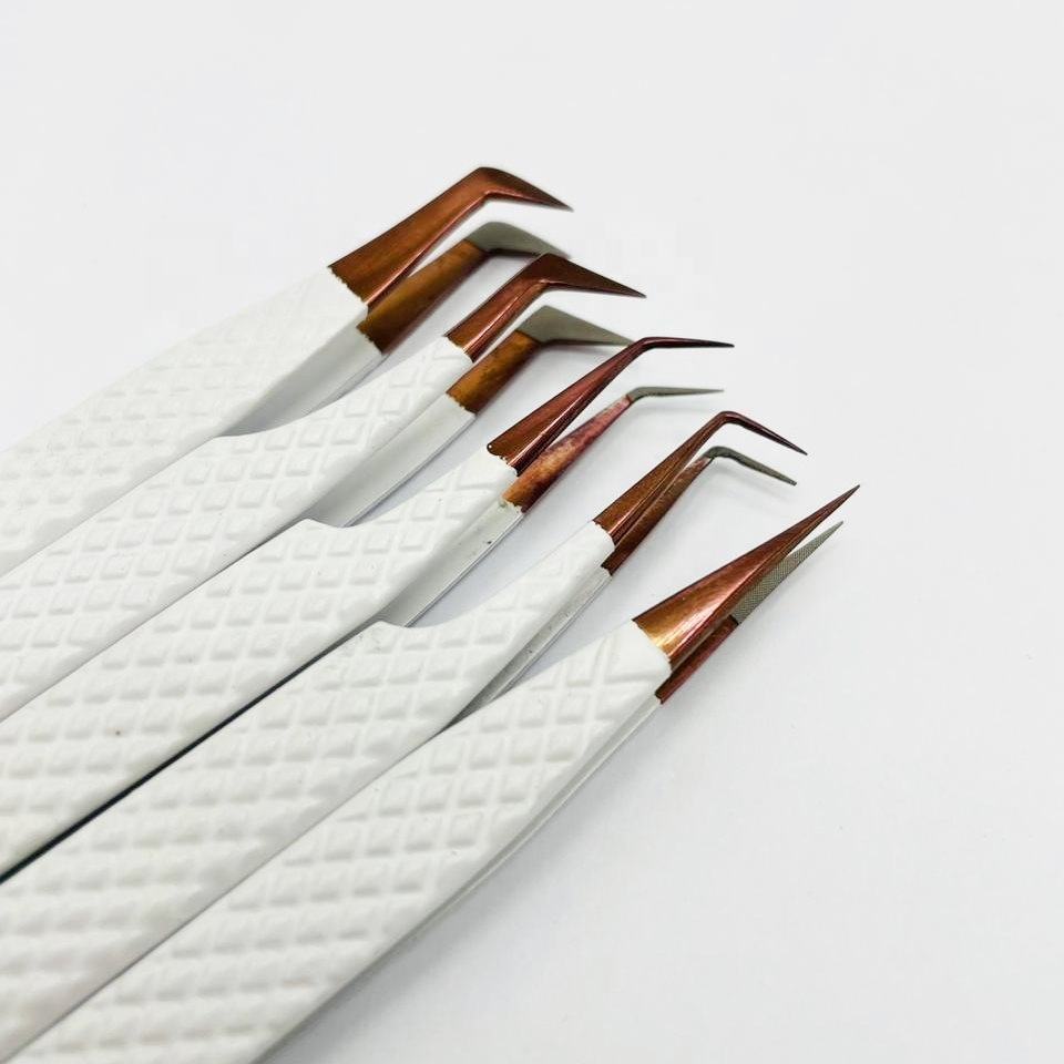 ชุดแหนบปลายขนตาสีขาวทำจากเส้นใยโรสโกลด์คุณภาพสูงด้ามจับเพชรทำจากสเตนเลสสามารถปรับแต่งโลโก้ได้อย่างยั่งยืน