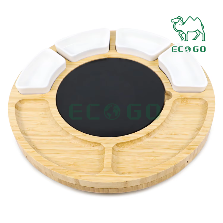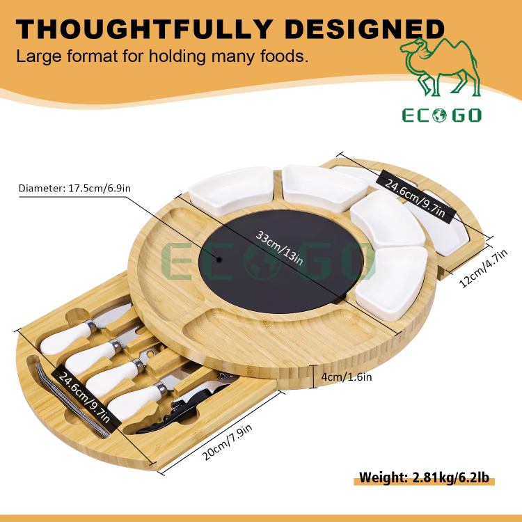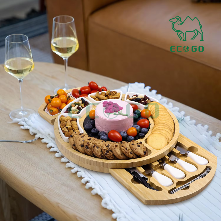 ชุดบอร์ดและมีดหั่นชีสและชาร์คิวรี่ทำจากไม้ไผ่ทรงกลมพร้อมจานเซรามิกสำหรับห้องครัว
