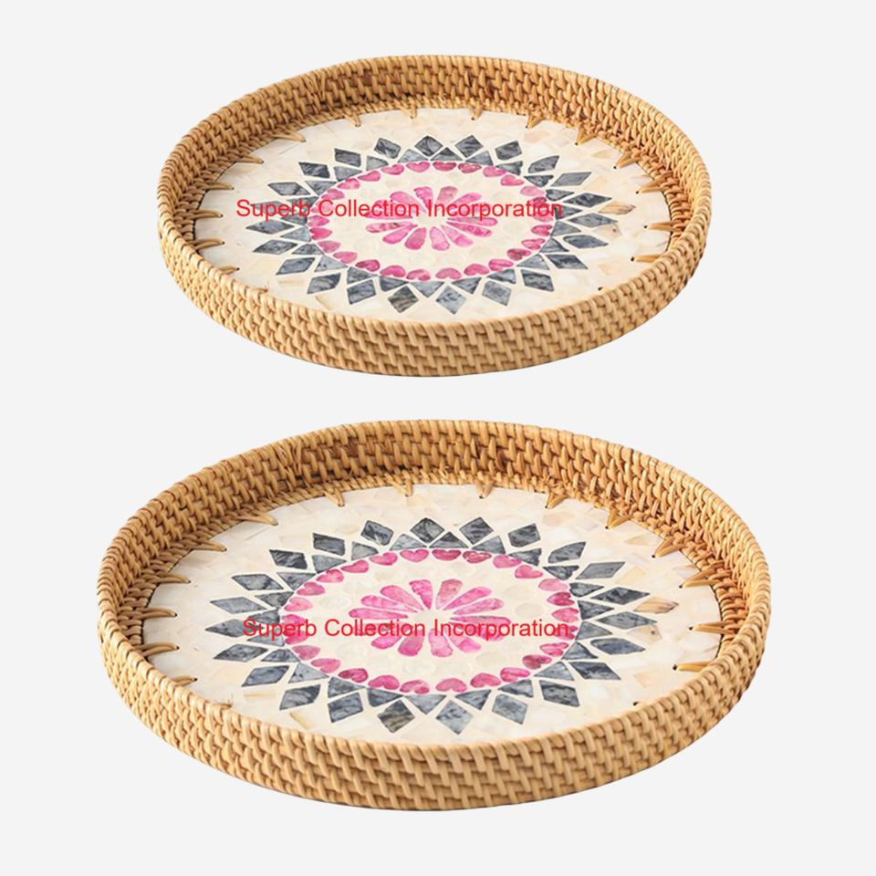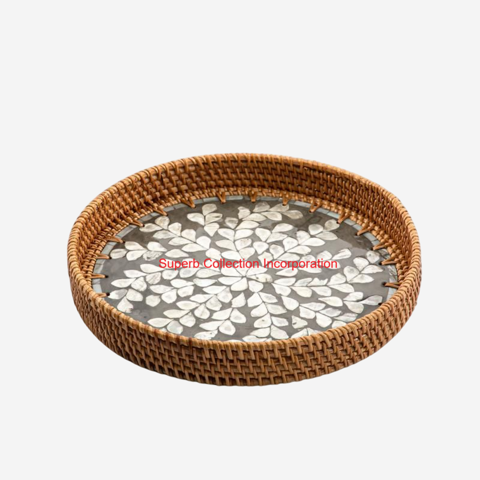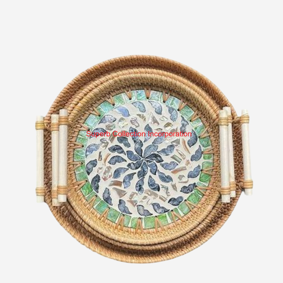 ถาดหวายทรงกลมคุณภาพสูงถาดเสิร์ฟพร้อมเปลือกหอยมุกธรรมชาติฝังโมเสคและมือจับถาดเป็นมิตรกับสิ่งแวดล้อมสำหรับใช้ในบ้าน