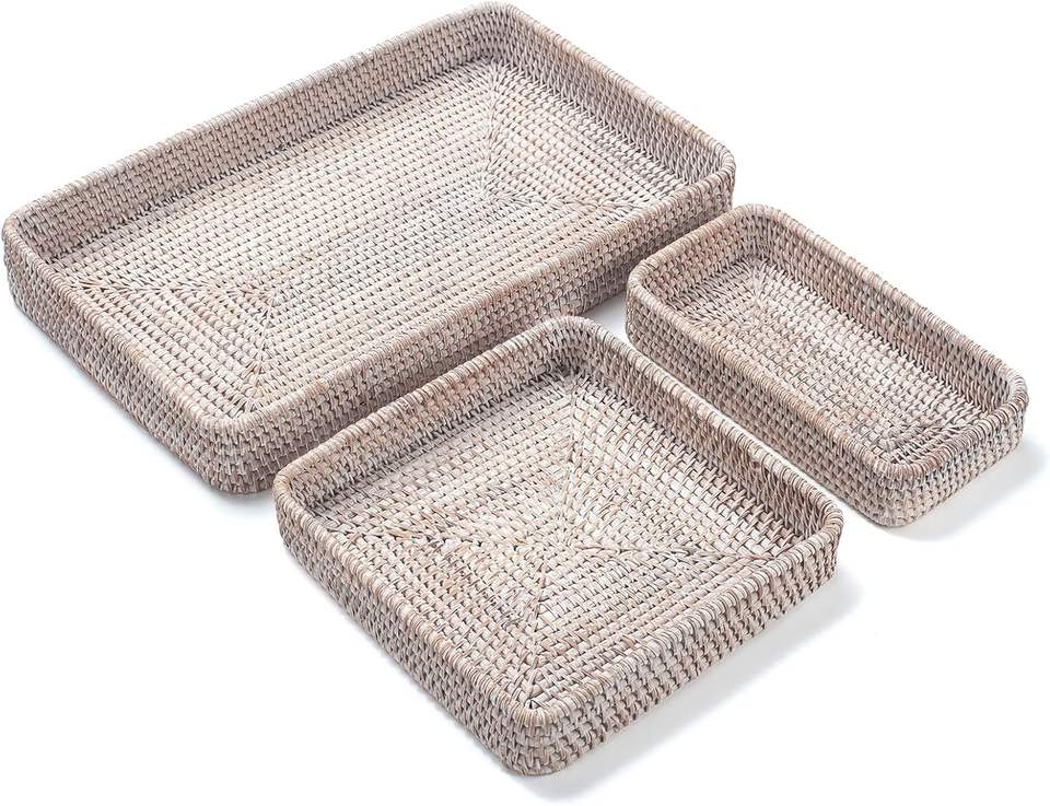 ชุดถาดเสิร์ฟหวายตกแต่งคุณภาพสูง 3 ชิ้น ทำด้วยมือ เป็นมิตรกับสิ่งแวดล้อม รีไซเคิลได้ สีตามสั่ง ผิวขัดเงา สำหรับใช้ในครัวเรือน
