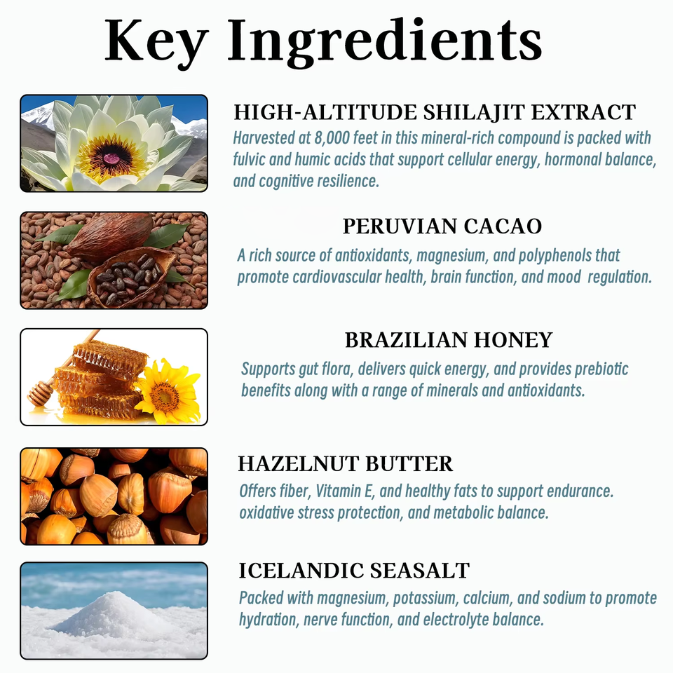 ส่วนผสมหลัก:สารสกัดชิลาจิตจากที่สูง, เกลือทะเลไอซ์แลนด์, โกโก้เปรู