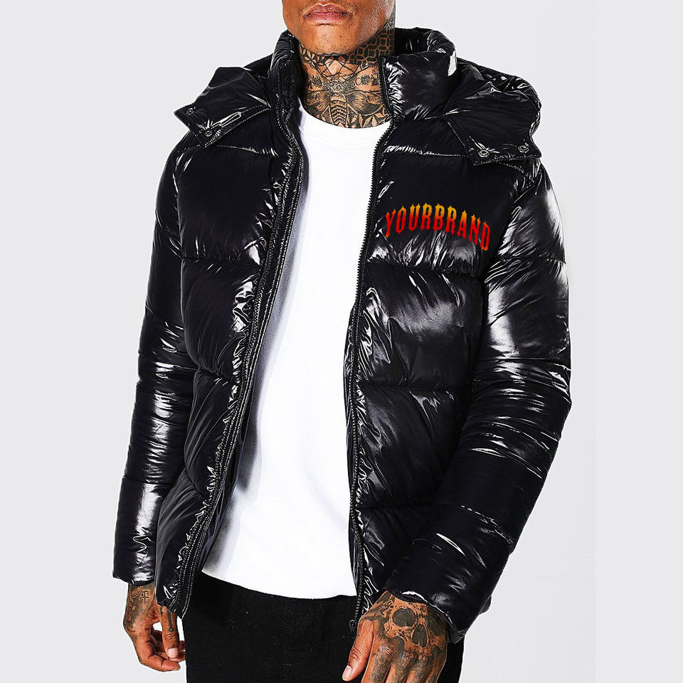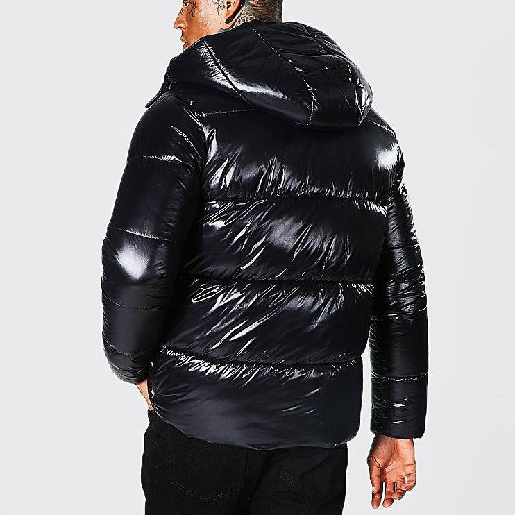 แจ็กเก็ตทรงปลาปักเป้าผ้าใบสีดำเงาวาวทำให้ความอบอุ่นหนาอบอุ่นกันน้ำกันลมใส่ได้พอดีกับผู้ชาย
