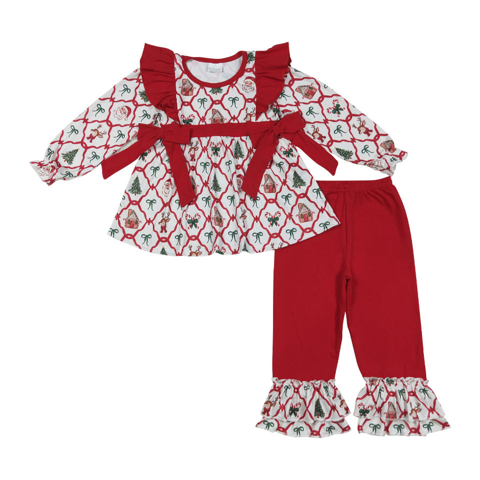 ชุดเสื้อผ้าบูติกสำหรับเด็กผู้หญิงกางเกงสีแดงแขนยาวลายต้นคริสมาสต์ลูกกวาดทำจากผ้าไหม
