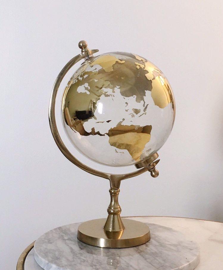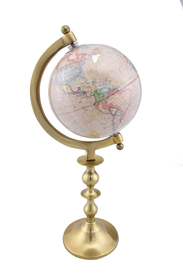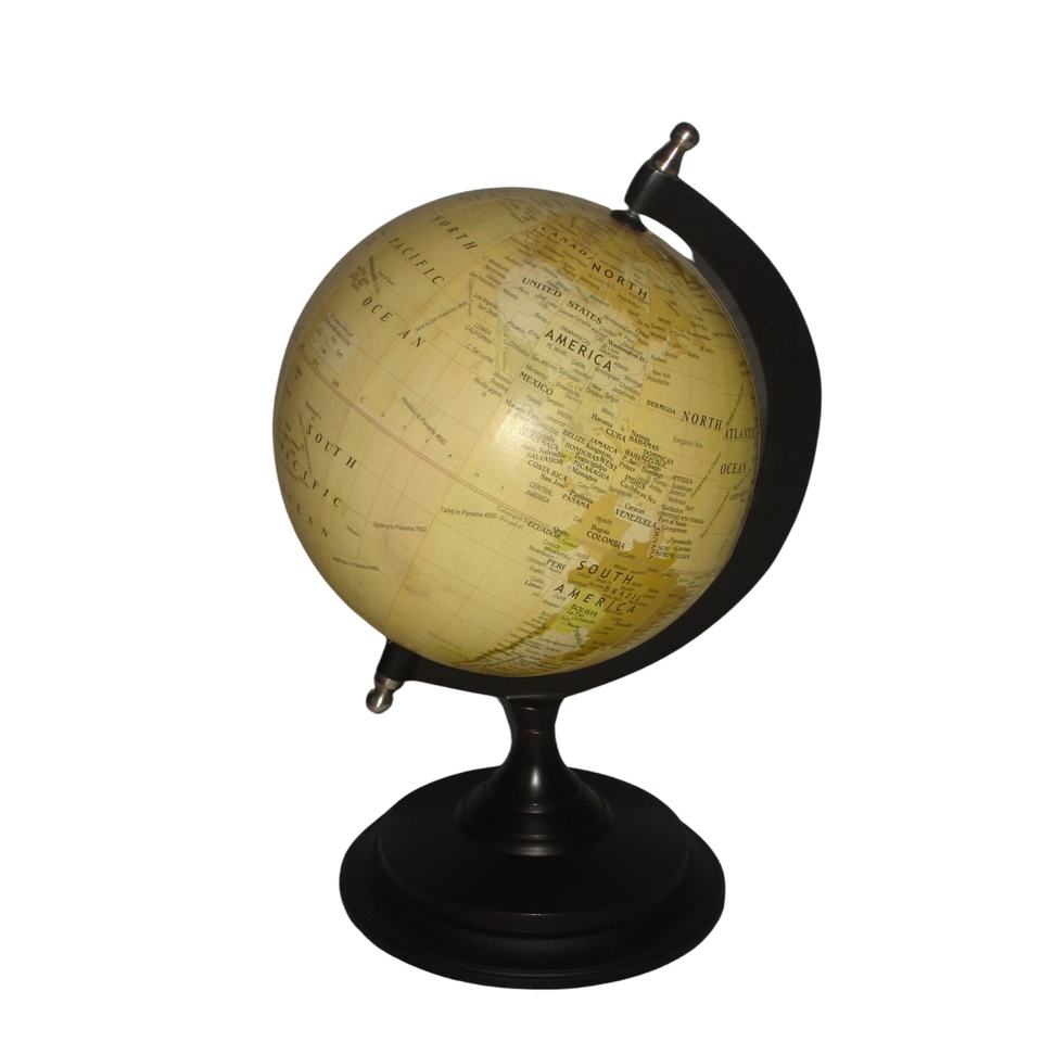 ลูกโลกตั้งโต๊ะคุณภาพสูง ทำจากโลหะเงิน พร้อมฐานไม้ ขัดเงาอย่างดี รูปแบบแผนที่โลกที่เป็นเอกลักษณ์