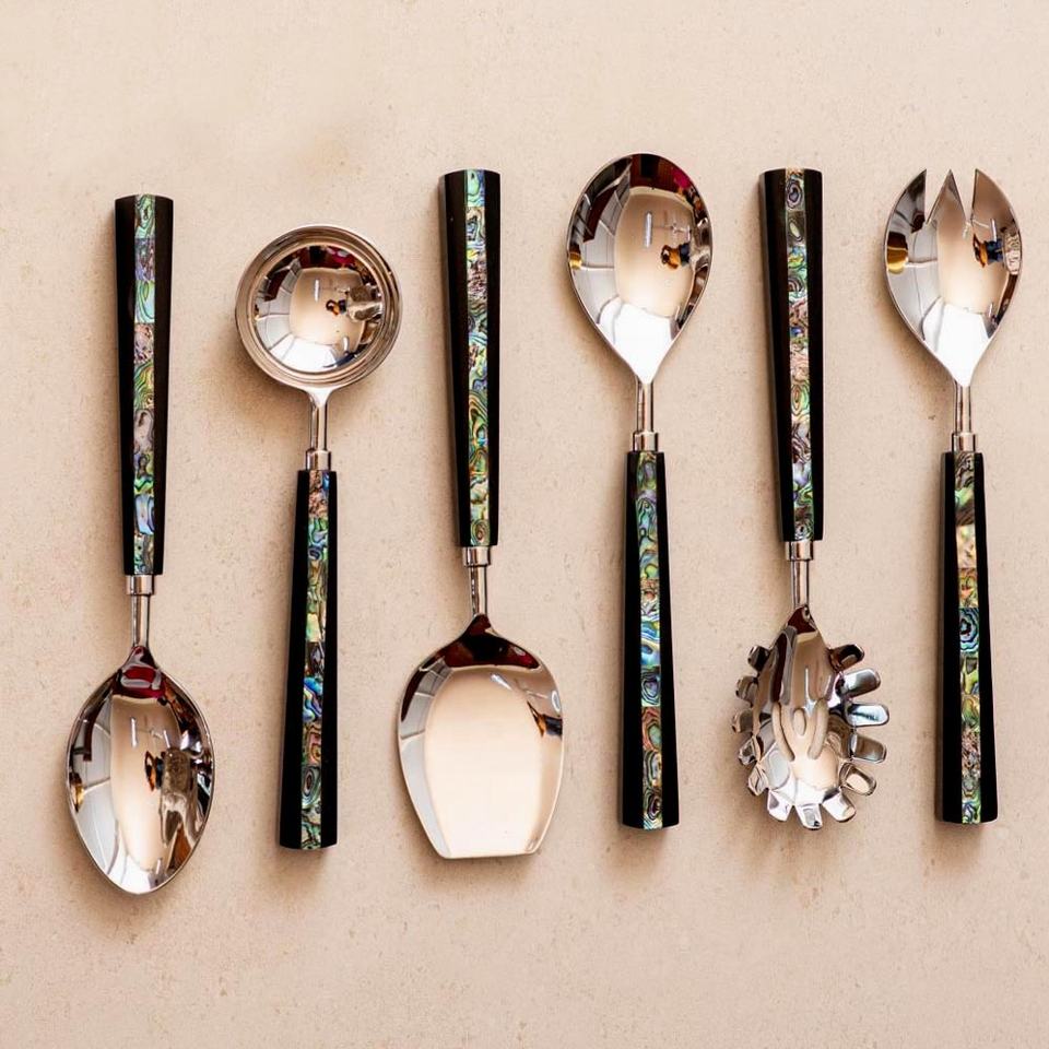 ชุดเซ็ตสลัดช้อนเงินคุณภาพสูง,มีหลายสีที่จับไม้ถูพื้นเสิร์ฟช้อนชุดช้อนสลัดเงิน