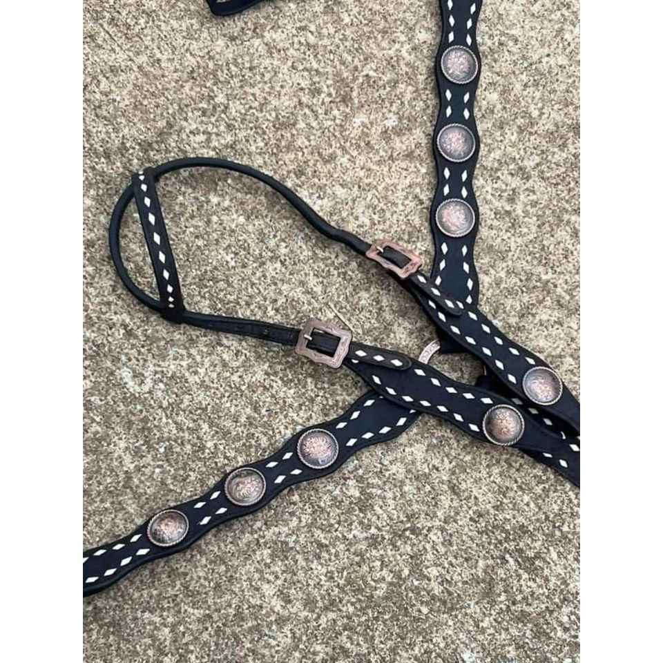 ชุดบังเหียนและสายรัดอกม้าหนังแท้คุณภาพสูงแบบหัวม้าตะวันตก ตกแต่งด้วยขนม้าถักแบบสาน สามารถปรับแต่งได้