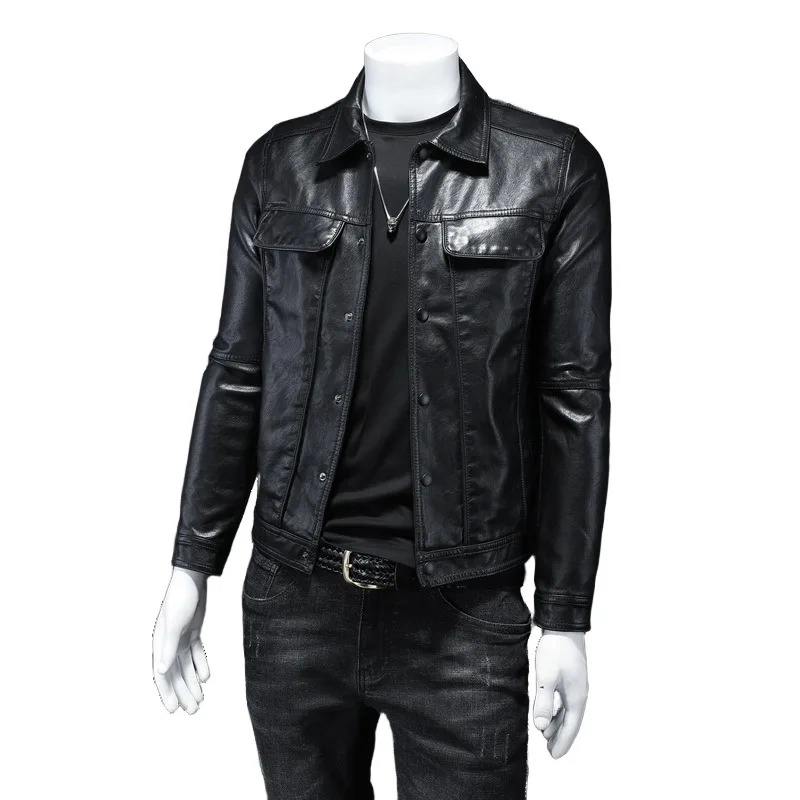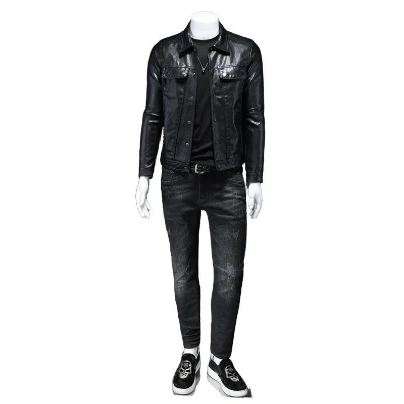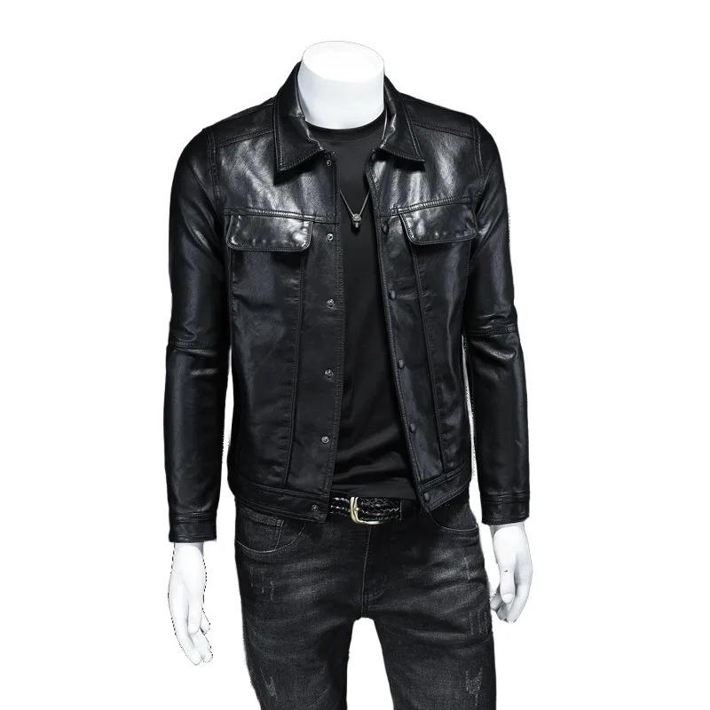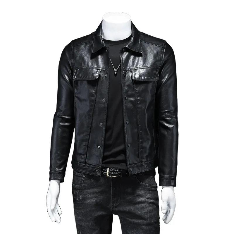 แจ็กเก็ตหนังเต็มตัวคอปกตั้งของผู้ชายทรงสลิมฟิตมีซิปสีดำลายทางที่น่าสนใจสำหรับฤดูหนาว