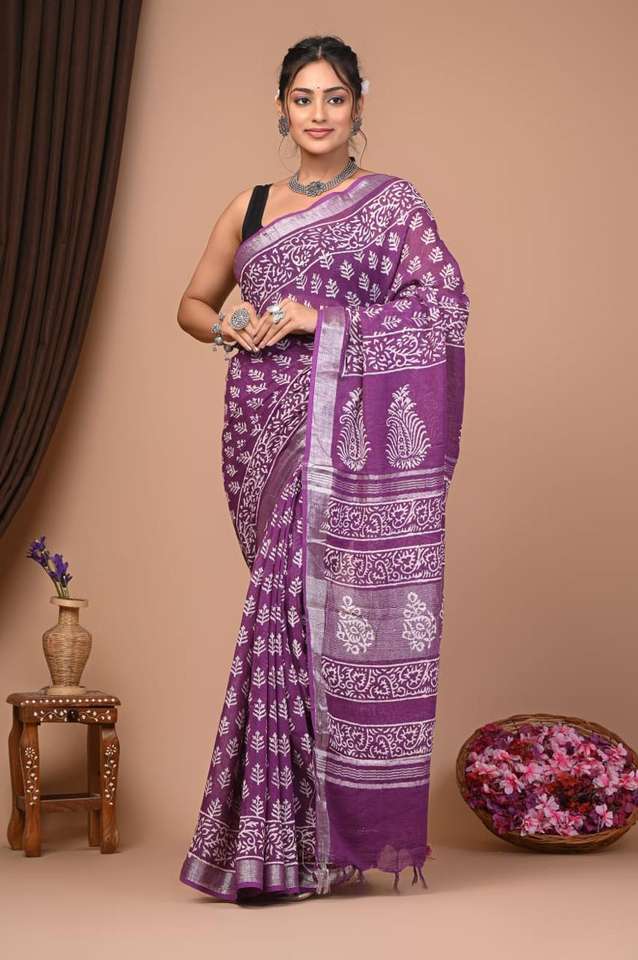 High Quality Soft Linen Cotton Saree with Batik Print Woven Silver Border and Pallu for Indian & Pakistani Parties